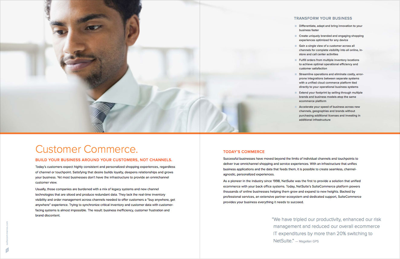 Design of a brochure, available in print and as downloadable pdf, promoting a complete ecommerce solution.